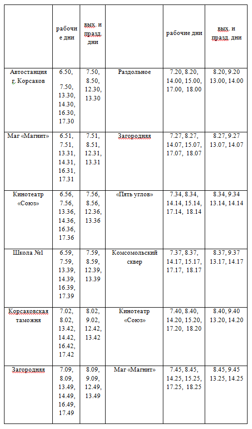 | Загородняя «Пять углов» Комсомольский сквер Кинотеатр «Союз» Магазин «Магнит» Автостанция г. Корсаков |