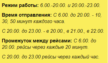 | Первый рейс: 06:00 | Последний рейс: 23:00 |
