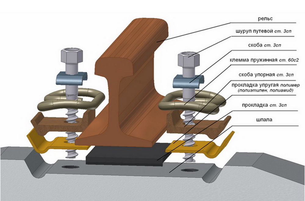 - Клеммные болты специальной формы - обеспечивают жесткую фиксацию рельса к шпале