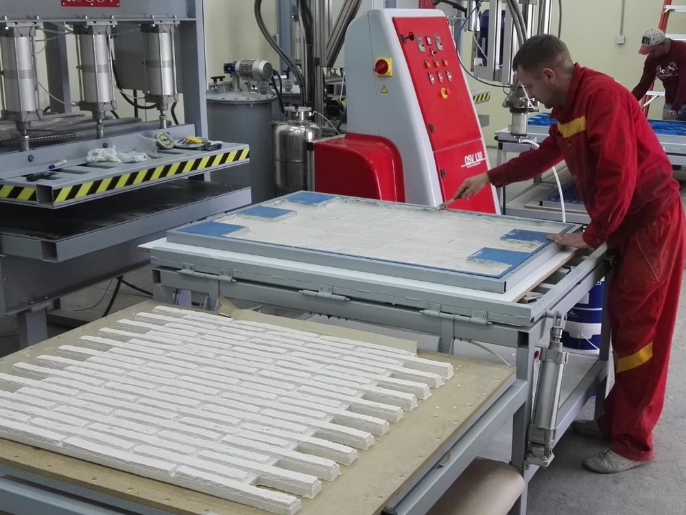 - Прессовое оборудование: Вакуумный или гидравлический пресс, который создаёт необходимое давление для обеспечения максимально плотного и равномерного прилегания облицовочной плитки к утеплителю на весь период полимеризации клея.
