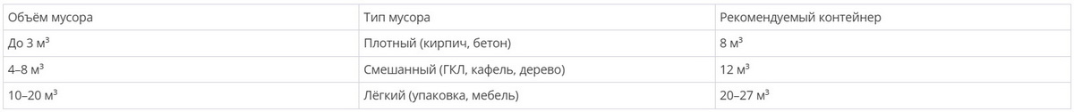 - 12 м³ — универсальный вариант, удобен при ремонте квартир (демонтаж гипсокартона, мебели, снятие штукатурки);
