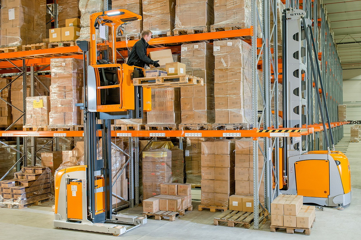 - Подборщики заказов (ордер-пикеры): Машины, поднимающие оператора для отбора штучного товара с полок стеллажей.