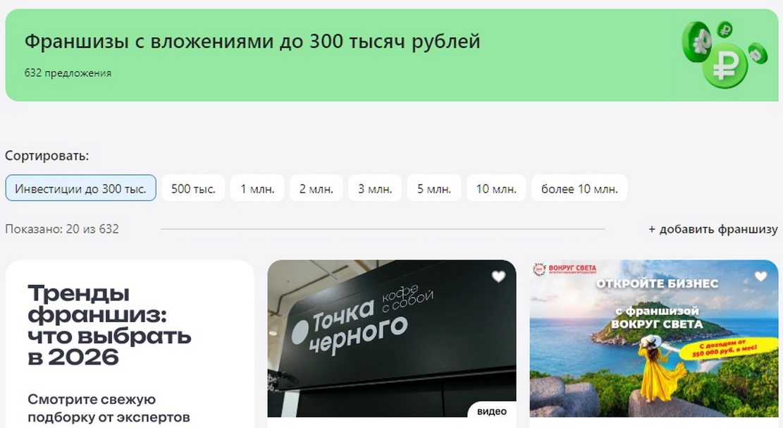 Интерфейс ресурса выполнен с расчетом на деловую аудиторию: нет ничего лишнего, основные функции поиска и сортировки работают быстро. Можно отфильтровать предложения по городу, сумме инвестиций или дате добавления. Это удобно для мониторинга рынка: достаточно раз в неделю просматривать новые поступления, чтобы не пропустить интересный вариант. Некоторые компании предлагают готовые бизнес-решения на особых условиях, например, с рассрочкой паушального взноса или без роялти на первый год работы, что также отображается в фильтрах.