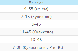 | Первый рейс: 04:55 | Последний рейс: 17:40 |