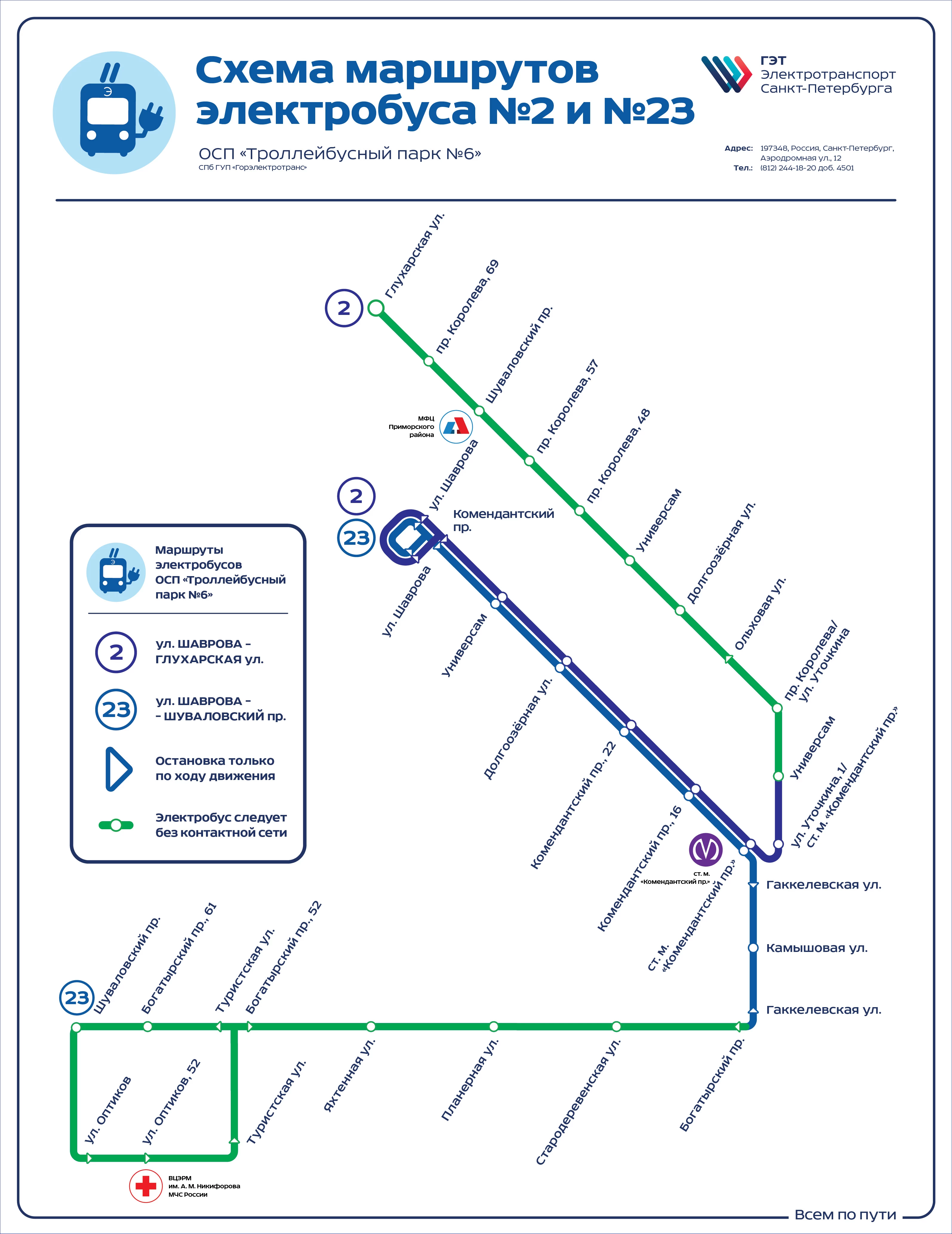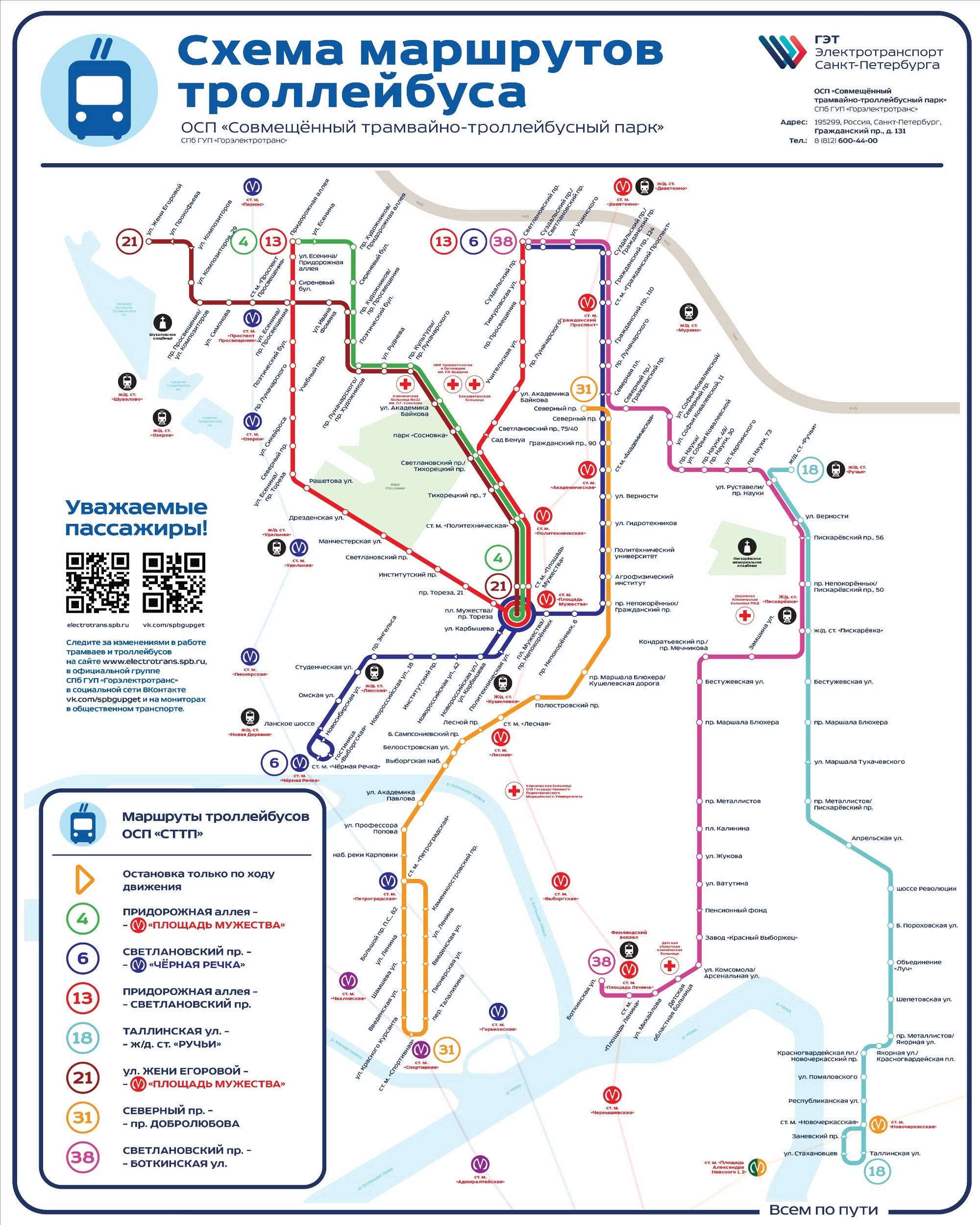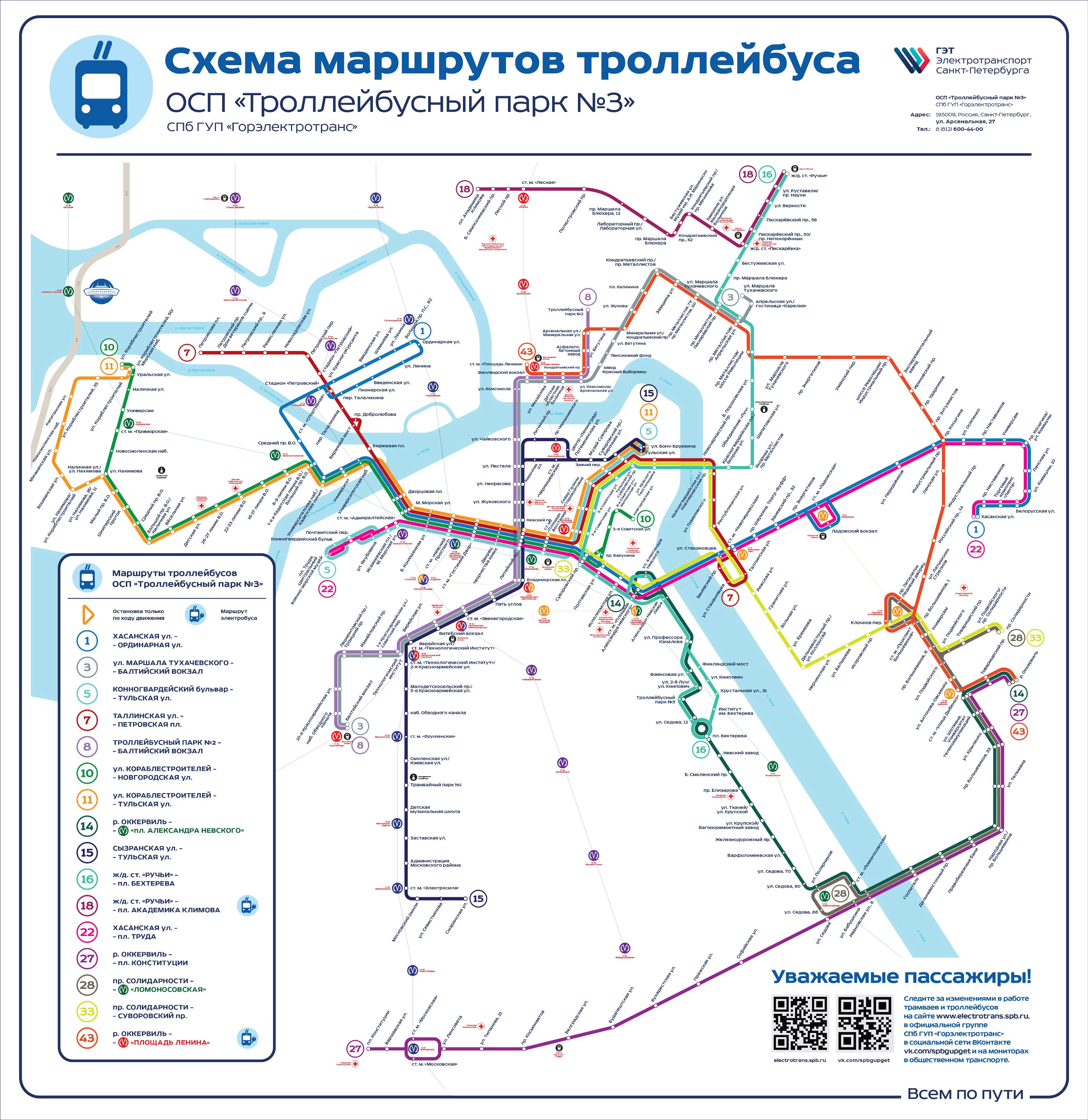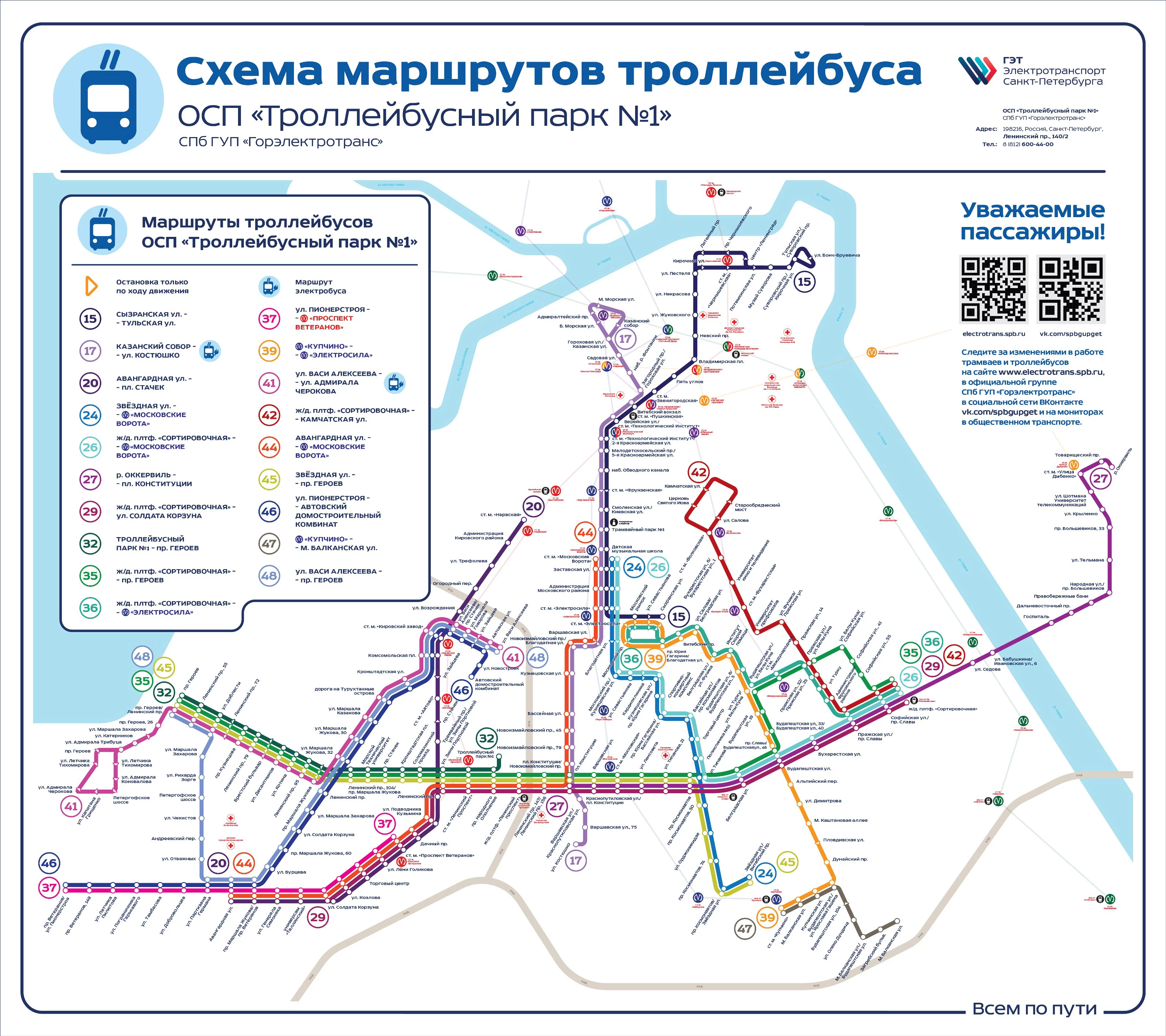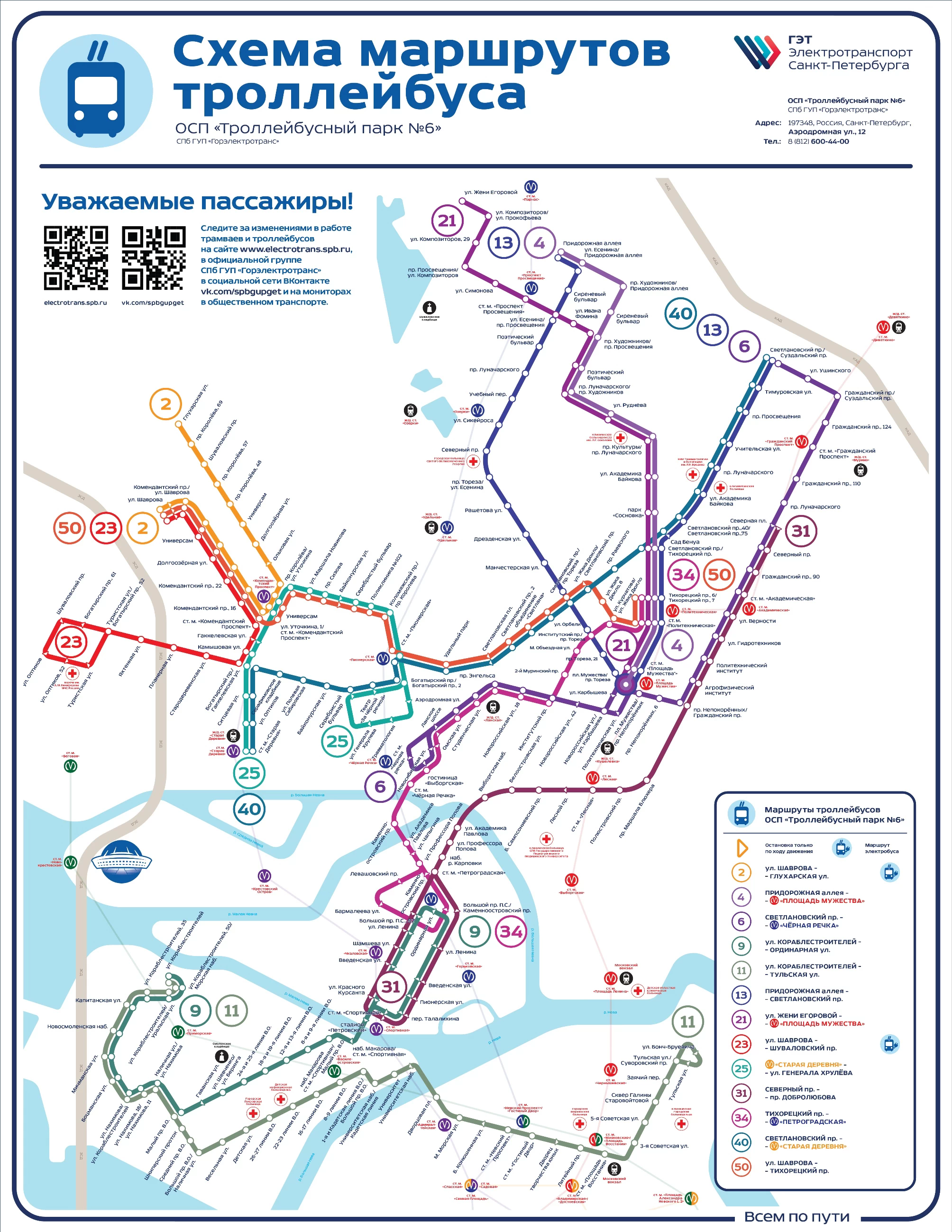 * В списке маршрутов троллейбусов Санкт-Петербурга указаны время в пути между конечными остановками и количество отзывов. Кликните на маршрут и узнаете его расписание движения.